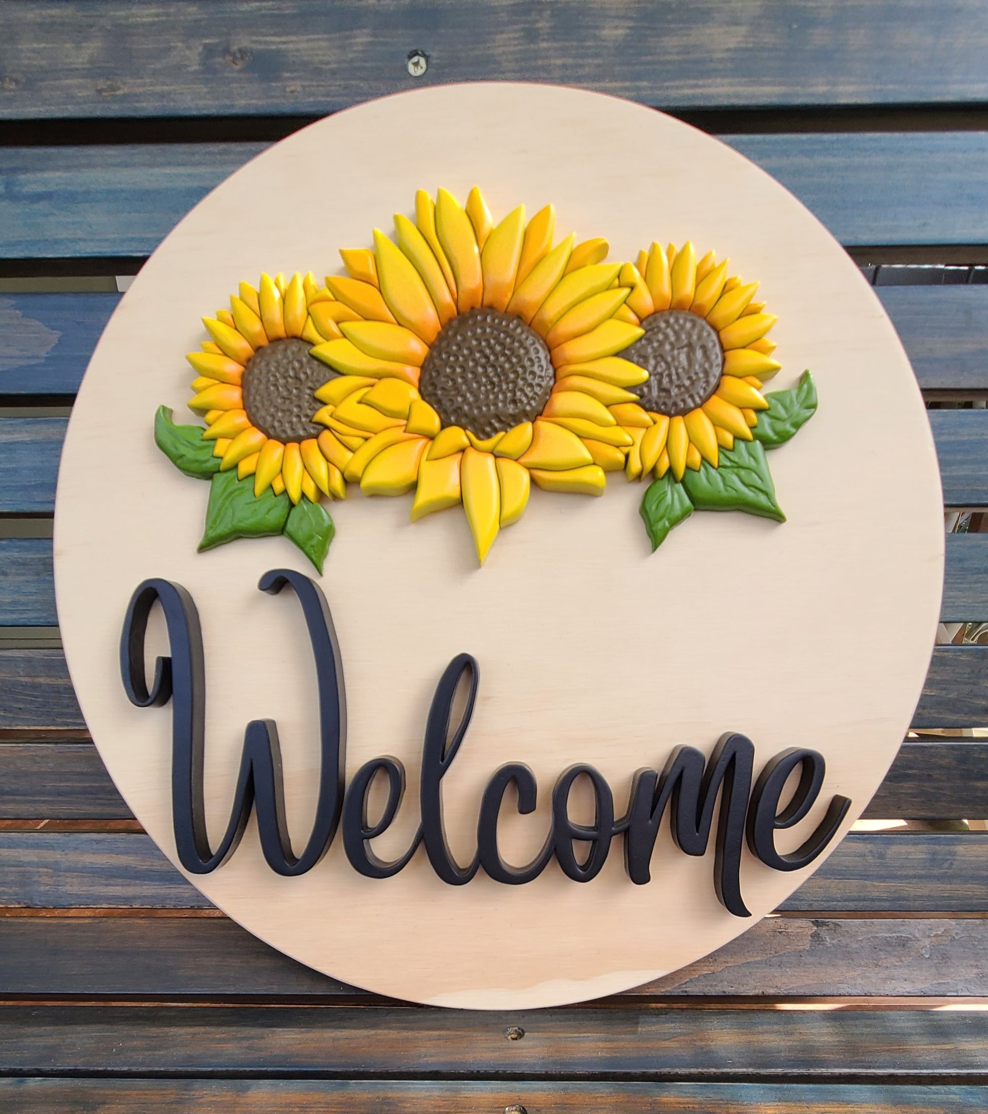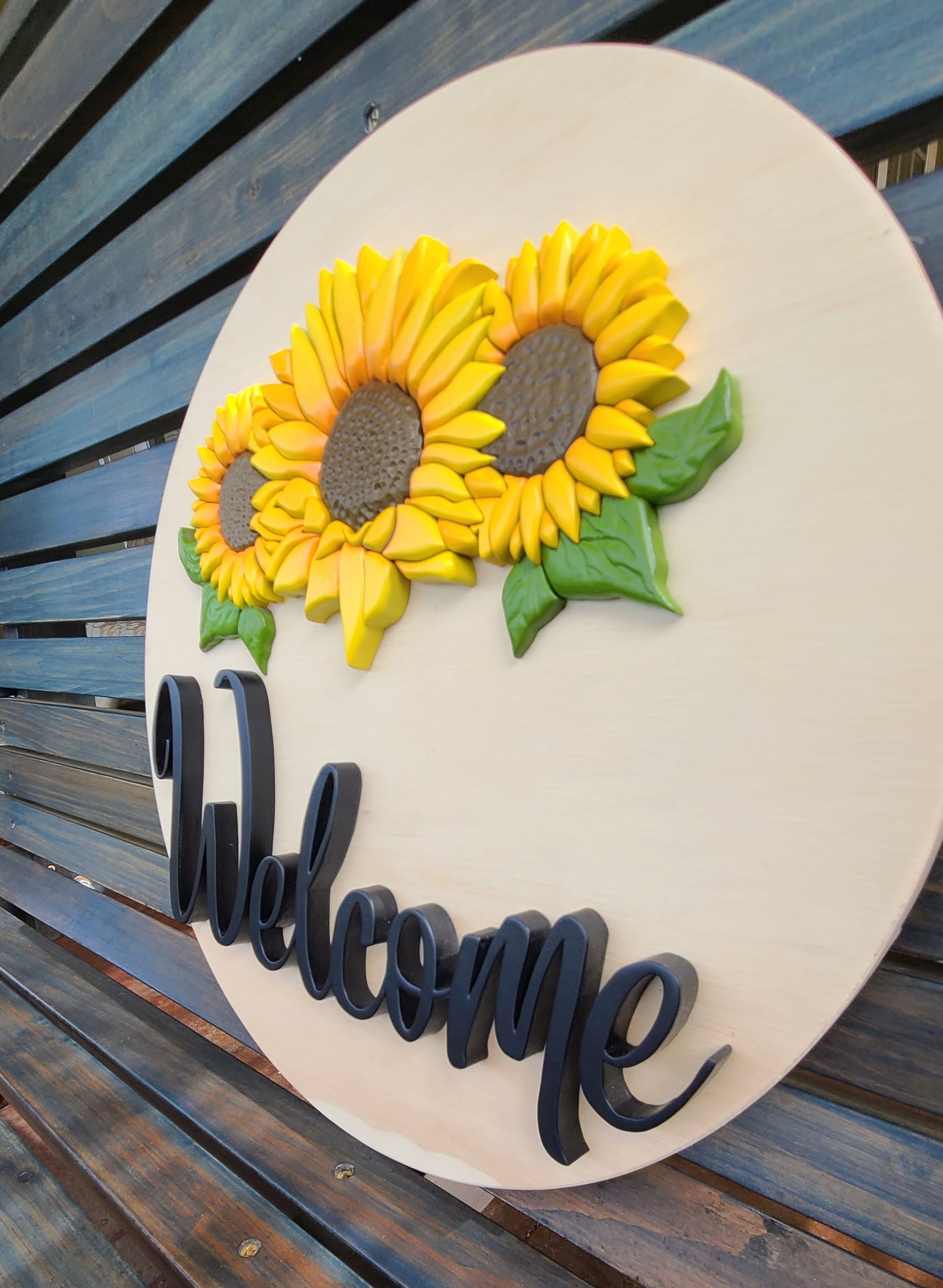 This 15.5" welcome sign features three sunflowers that have been sanded and shaped in order to provide a detailed look to them.